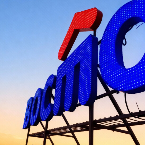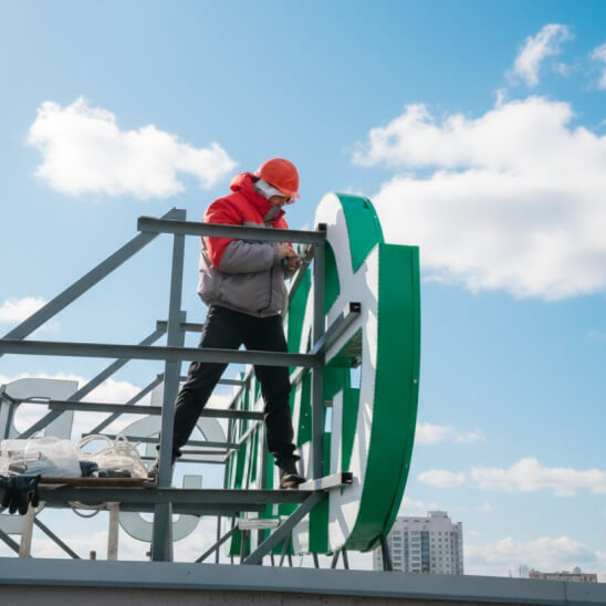 Крупные конструкции, которые ставятся на крышах зданий для максимальной видимости издалека. Могут эмблемы и логотипы. Подходят для ТЦ, бизнес-центров и крупных компаний.